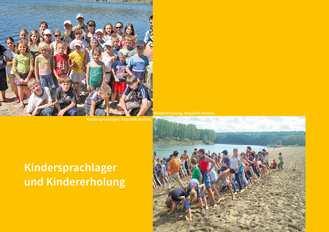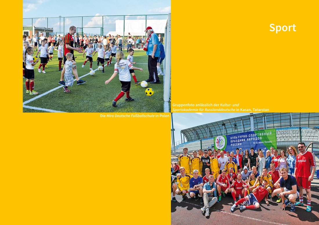 Dazu gehören beispielsweise Miro Deutsche Fußballschulen in Polen, Sommersprachlager in Kasachstan und Russland, Fahrradtouren von der Ukraine nach Deutschland. Sommercamps und Freizeitveranstaltungen für Jugendliche der deutschen Minderheiten, die Deutschkurse und Workshops mit sportlichen Aktivitäten verbinden, leisten einen wichtigen Beitrag zur Pflege der deutschen Identität und Sprache bei der jungen Generation der deutschen Minderheiten. Besondere Bedeutung nehmen auch grenzüberschreitende Jugendprojekte ein. Sie dienen der besseren Vernetzung der deutschstämmigen Jugendlichen in ganz Mittel-, Südost- und Osteuropa. Zudem werden viele Jugendvereine der Minderheiten vom Bundesministerium des Innern gefördert, wie zum Beispiel die Deutsche Jugend Ungarn (DJU) oder die Jugendaktivitäten des Bundes der Jugend der Deutschen Minderheit in Polen (BJDM).